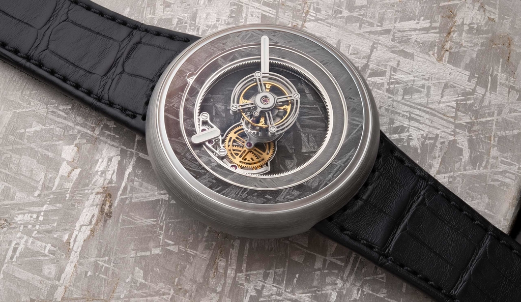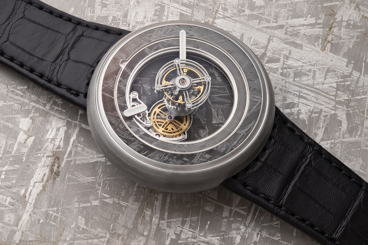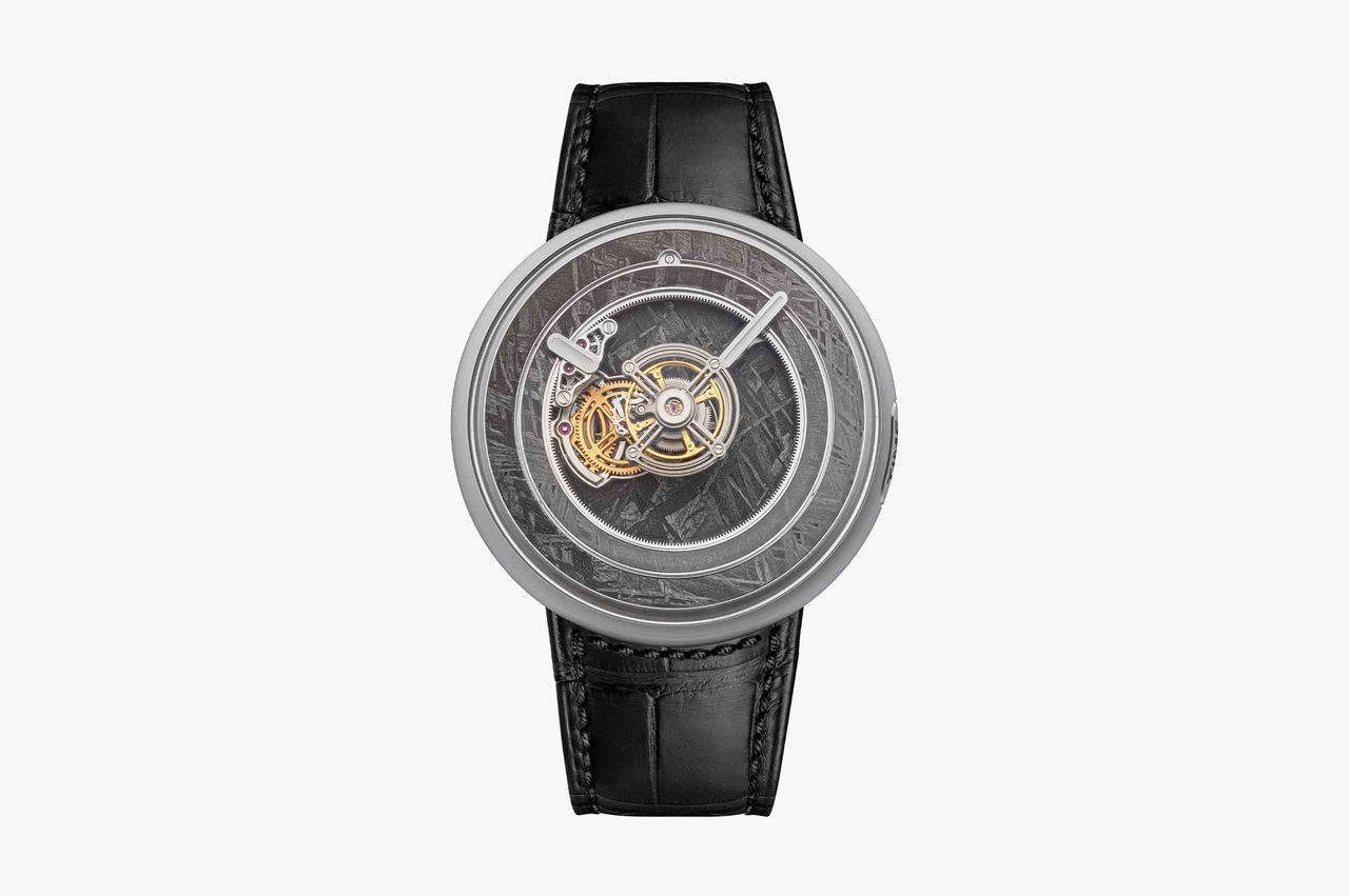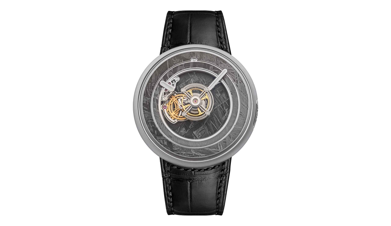 The inner dial, designed with an opening at 9 o'clock, is fixed onto the main plate of the movement. Positioned beneath the floating tourbillon and the time display mechanism, this innovative dial design allows a clear view onto the gear train and sets a captivating backdrop for the tourbillon, adding depth and setting a visual stage to display the watch's meticulous engineering