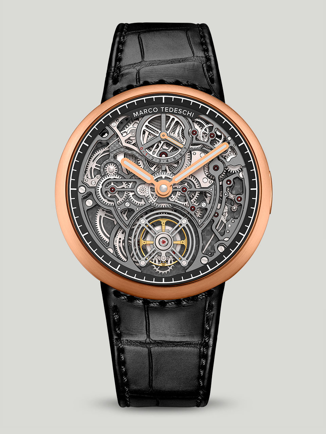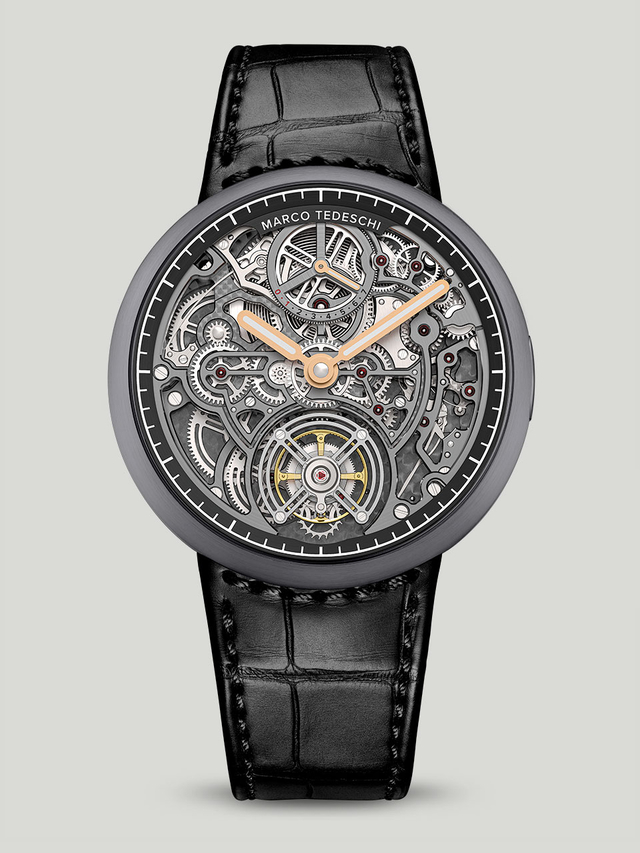 The front is fully open. The movement explains itself instantly. The mechanics revealed with intent. An openworked movement designed that way from the start. Legible, functional, aesthetical. Light, geometry and finishing reveal functions. Every component is hand-finished. The back is the opposite. An architecture closed by design, defined by intent. A single transversal bridge gives space to a pure canvas for Marco Tedeschi’s signature decoration: concentric geometries, circular patterns, flowing in repetition. A Zen aesthetic, engineered with precision.