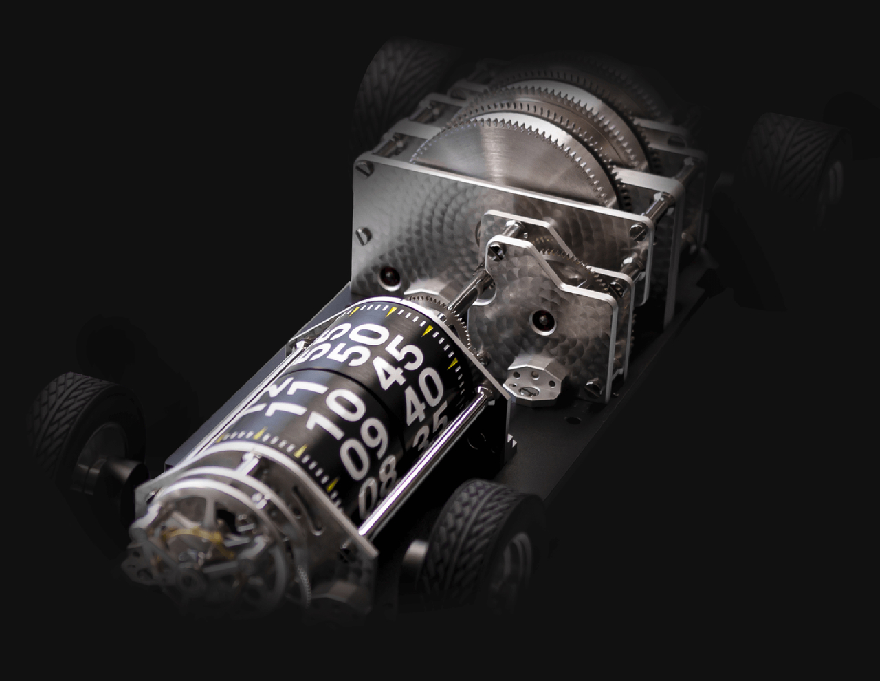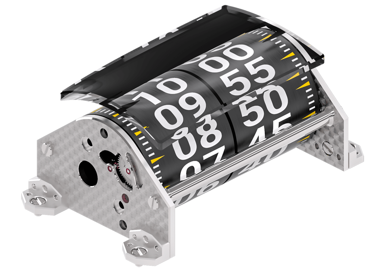 Manual-winding mechanical movement, hours and minutes displayed by two cylinders, vertical regulator