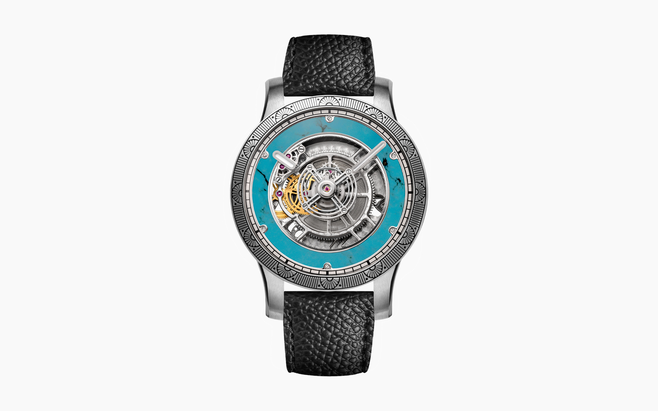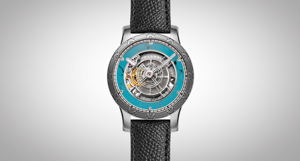 Turquoise Spider dial with black minute markers. Engraved silver bezel.
