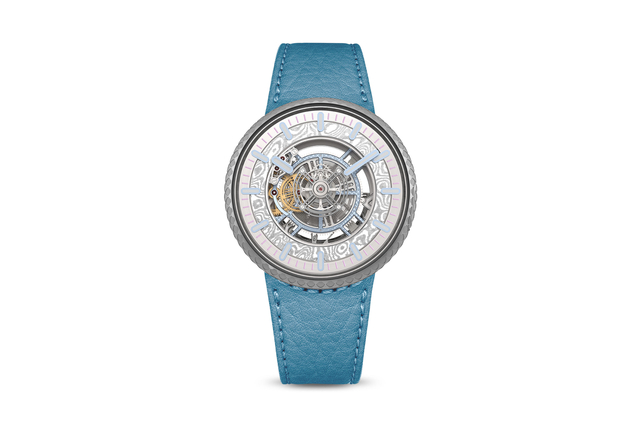Openworked dial with a Damasteel® part fixed to the hour wheel