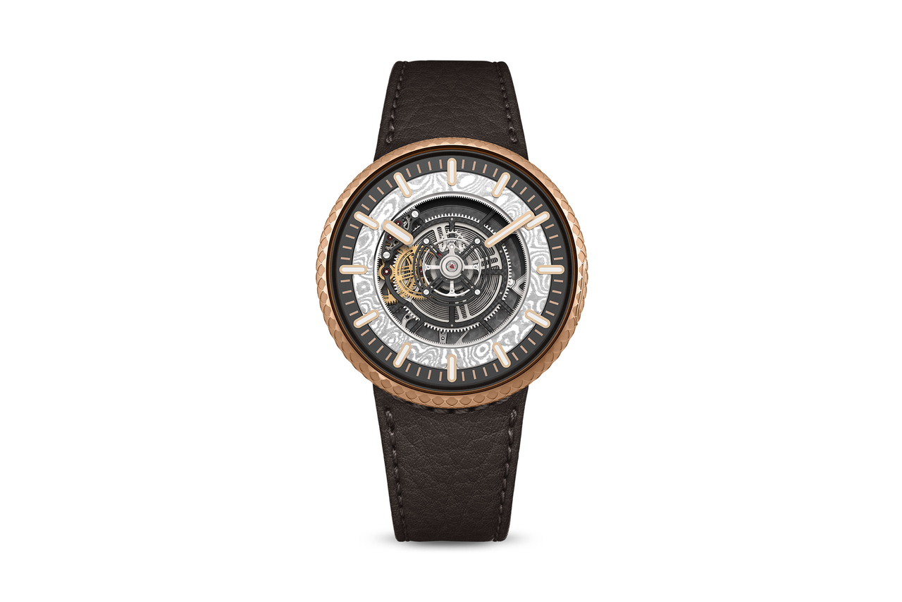 Openworked dial with a Damasteel® part fixed to the hour wheel