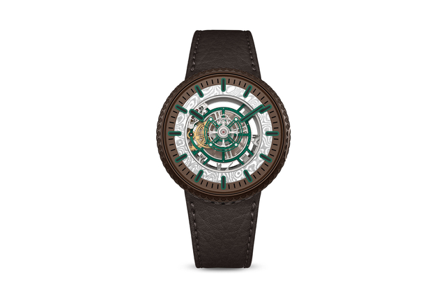 Openworked dial with a Damasteel® part fixed to the hour wheel