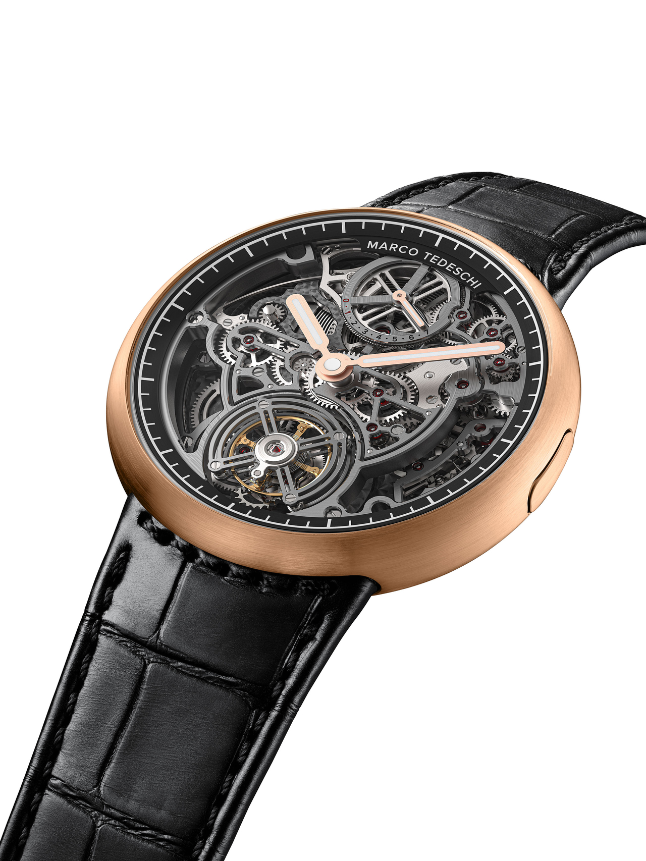 The MT1.1 is available in four different case materials: Grade 5 Titanium ELI with or without black DLC, 5N Gold and Tantalum. It features an elegant circular satin finish, subtly contrasted by polished chamfers that highlight its refined character. The main plate and bridges are made of lead-free nickel silver. Their surfaces combine satin-brushed and perlage finishes, while the edges are meticulously brushed and the bevels are polished by hand. A dark ruthenium treatment enhances the ensemble, creating a striking visual contrast. The steel components display a satin finish with polished angles, while each wheel is open worked and circled, reinforcing the visual harmony and depth of the movement.